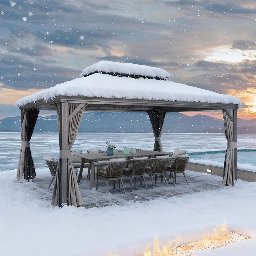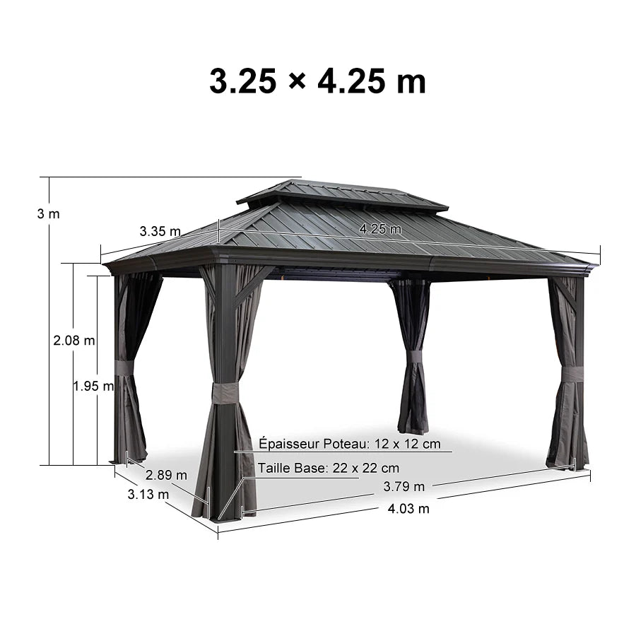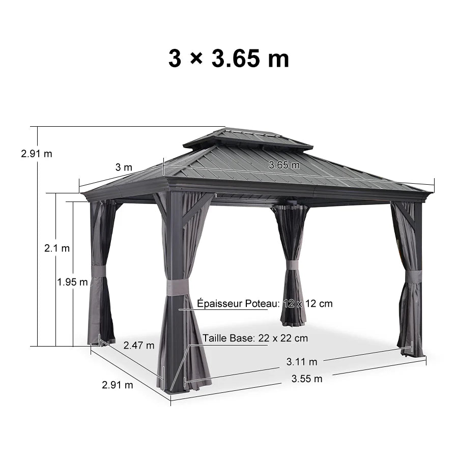 【Solido e Durevole】 Il tetto in acciaio zincato, resistente allo scolorimento e alla ruggine, blocca efficacemente la luce intensa e i nocivi raggi UV. La sua struttura robusta permette al gazebo di resistere a forti nevicate, garantendo una longevità ottimale.