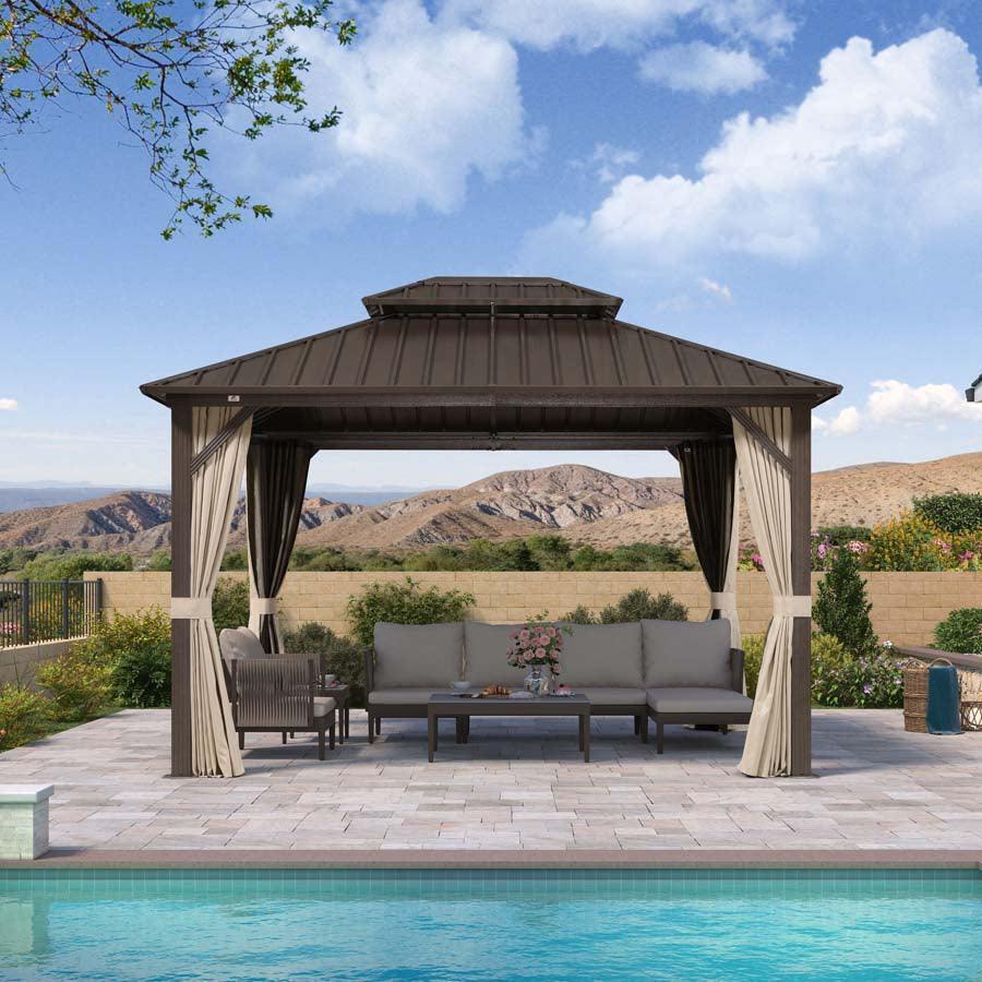 Si tratta di un gazebo da patio esterno elegante e robusto. Presenta un design semplice che offre un'ampia ombra e una protezione efficace contro la luce intensa, i raggi del sole e il calore eccessivo. Il gazebo con tetto rigido PURPLE LEAF ti permette di goderti il tuo giardino, che piova o tiri vento. Diventerà un'aggiunta permanente al tuo spazio esterno, ideale per intrattenere gli ospiti o semplicemente per rilassarsi da soli o in famiglia.