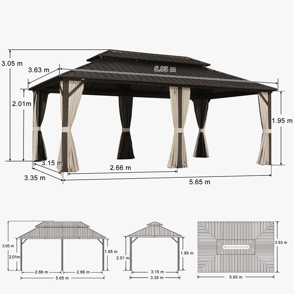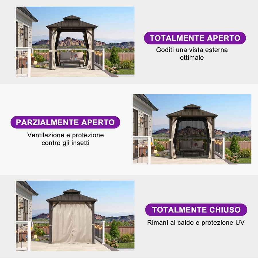 【Solido e Durevole】 Il tetto in acciaio zincato, resistente allo scolorimento e alla ruggine, blocca efficacemente la luce intensa e i nocivi raggi UV. La sua struttura robusta permette al gazebo di resistere a forti nevicate, garantendo una longevità ottimale.