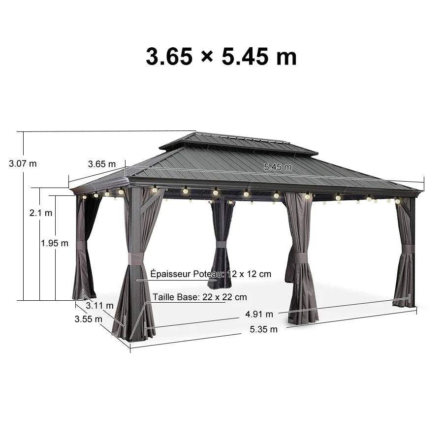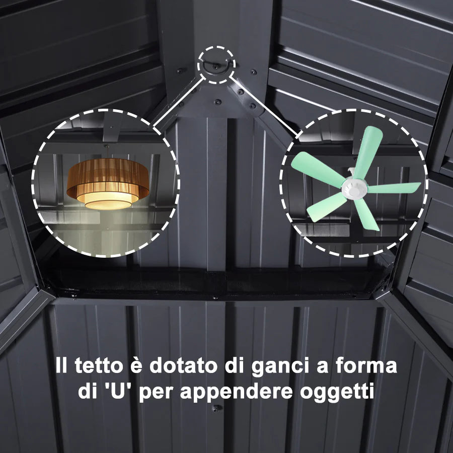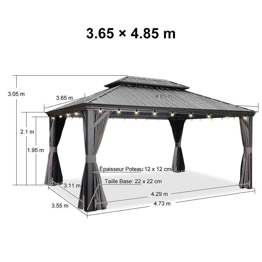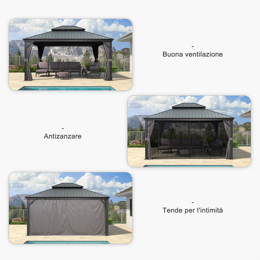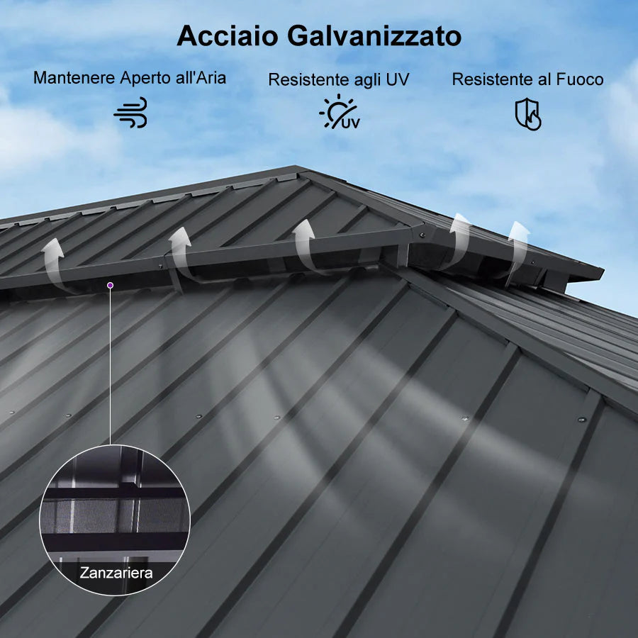 【Solido e Durevole】 Il tetto in acciaio zincato, resistente allo scolorimento e alla ruggine, blocca efficacemente la luce intensa e i nocivi raggi UV. La sua struttura robusta permette al gazebo di resistere a forti nevicate, garantendo una longevità ottimale.