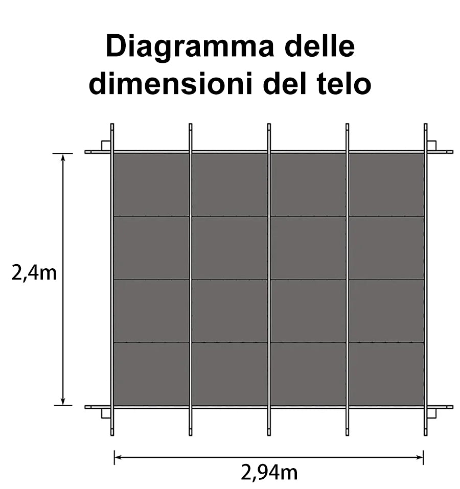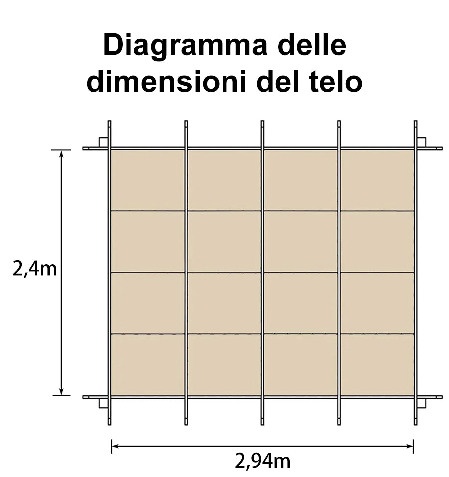 Il tetto parasole 3m x 3m misura 240 cm (Larghezza) x 295 cm (Lunghezza) per sostituire il tetto parasole per pergola PURPLE LEAF 3m x 3m.