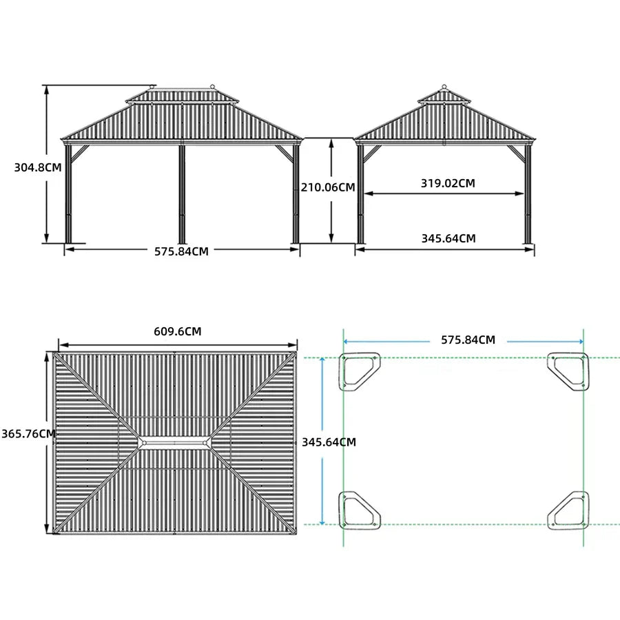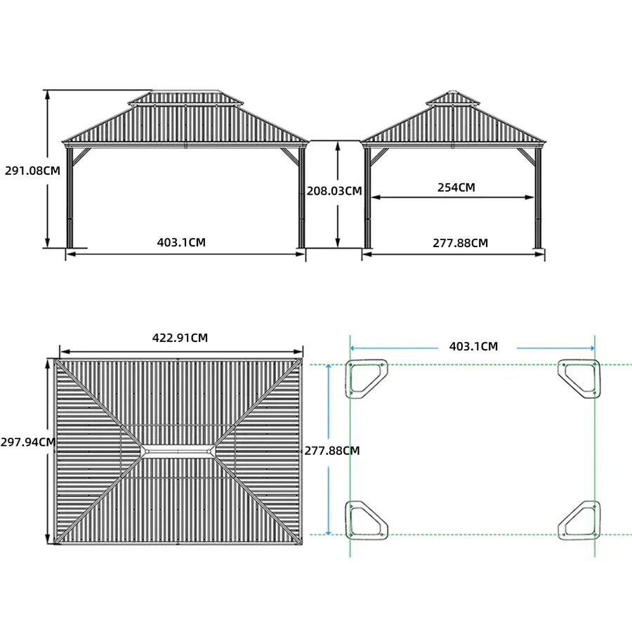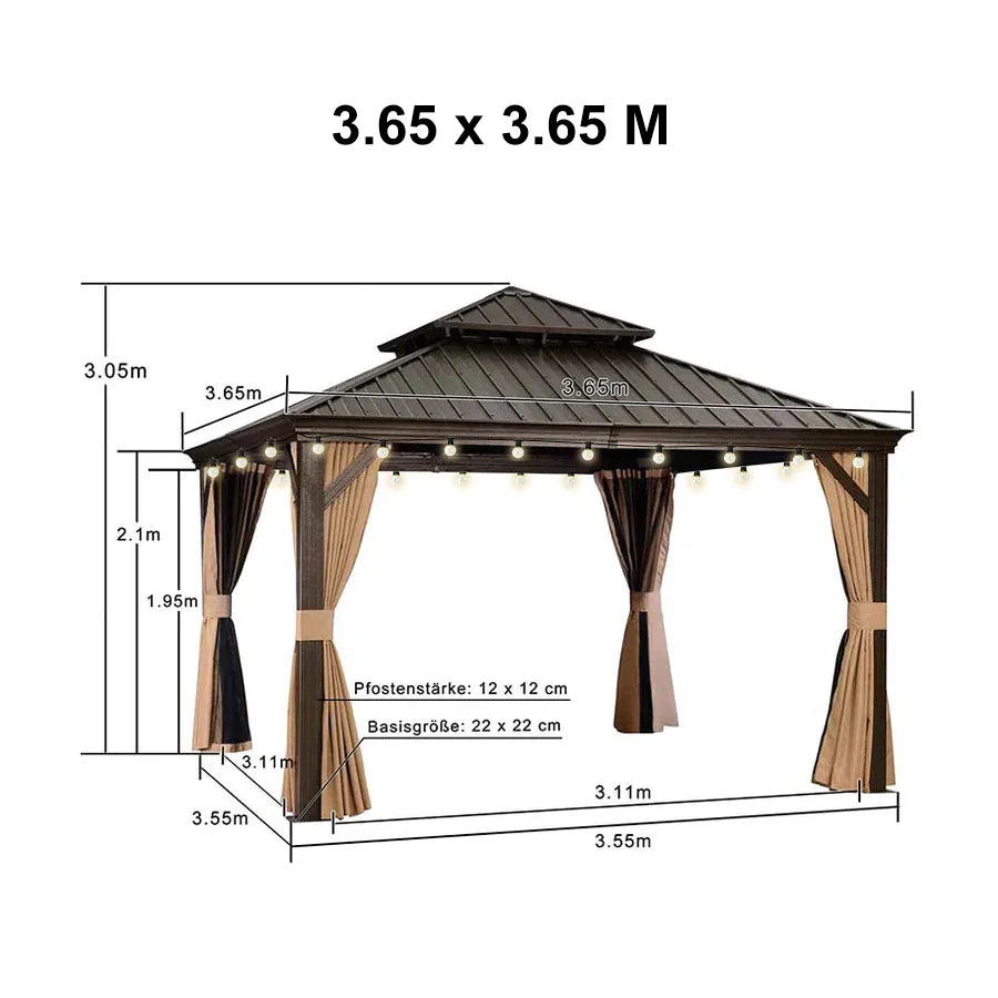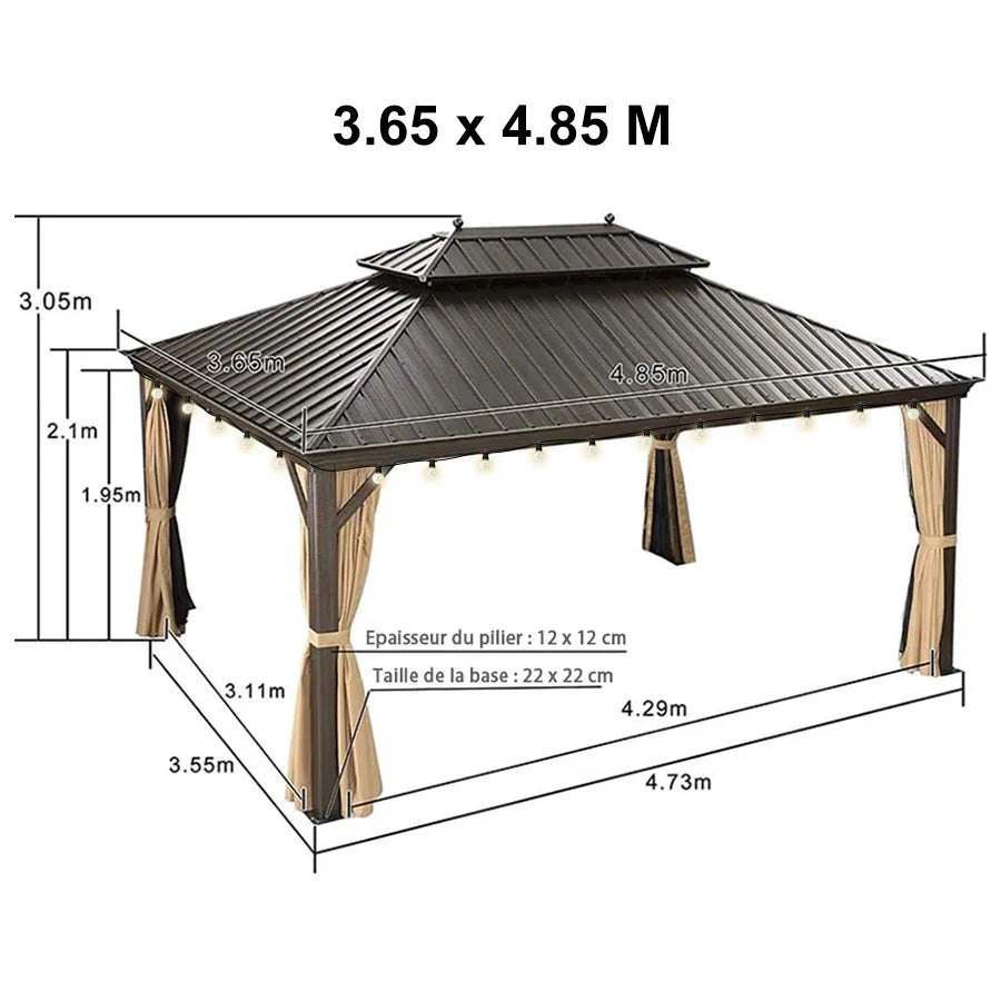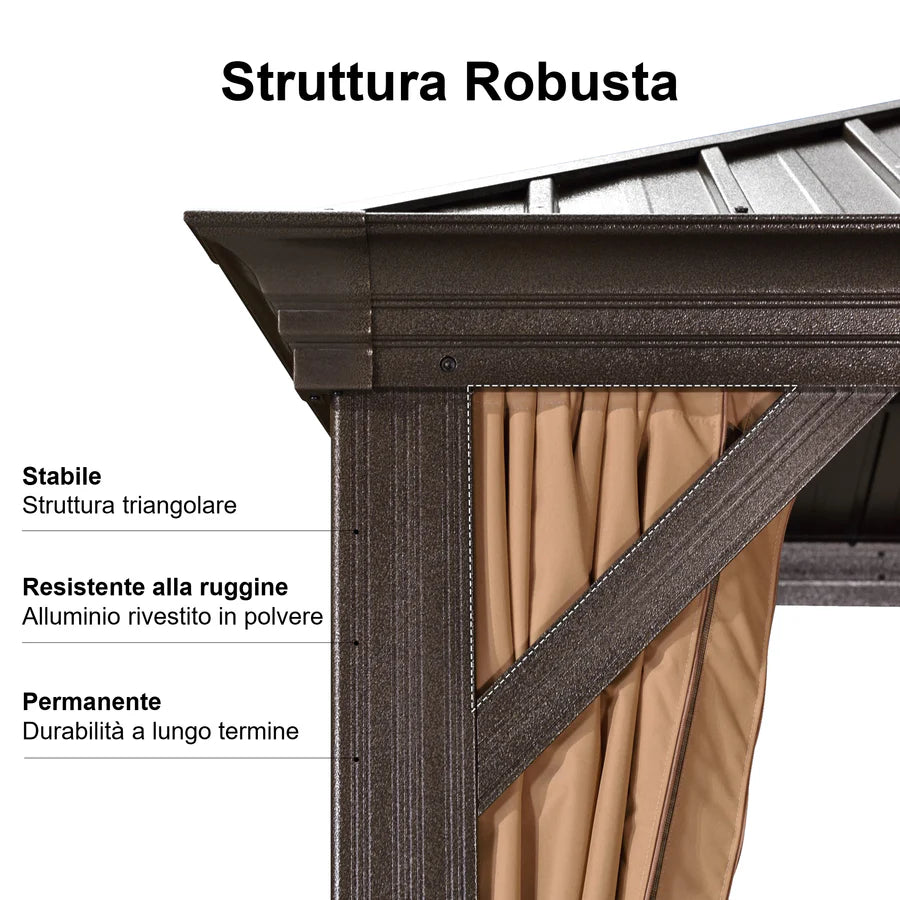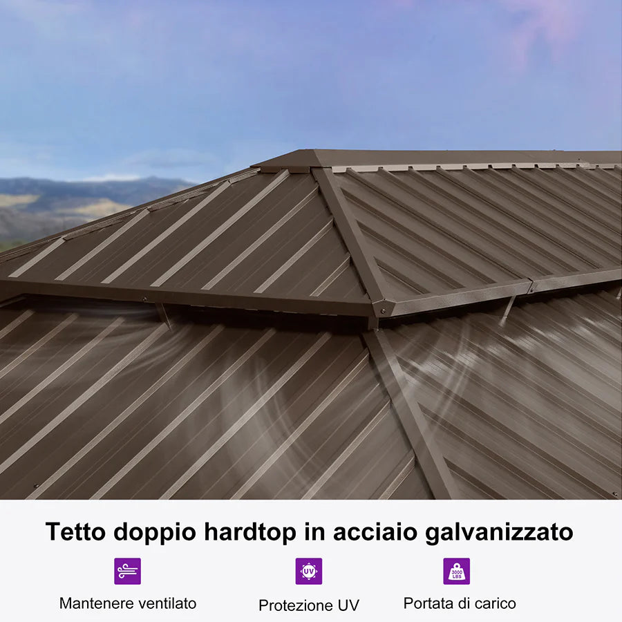 【Solido e Durevole】 Il tetto in acciaio zincato, resistente allo scolorimento e alla ruggine, blocca efficacemente la luce intensa e i nocivi raggi UV. La sua struttura robusta permette al gazebo di resistere a forti nevicate, garantendo una longevità ottimale.