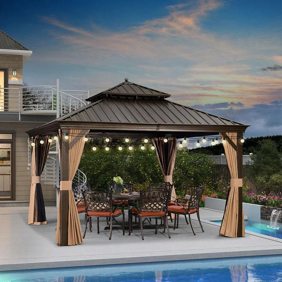 Si tratta di un gazebo da patio esterno elegante e robusto. Presenta un design semplice che offre un'ampia ombra e una protezione efficace contro la luce intensa, i raggi del sole e il calore eccessivo. Il gazebo con tetto rigido PURPLE LEAF ti permette di goderti il tuo giardino, che piova o tiri vento. Diventerà un'aggiunta permanente al tuo spazio esterno, ideale per intrattenere gli ospiti o semplicemente per rilassarsi da soli o in famiglia.